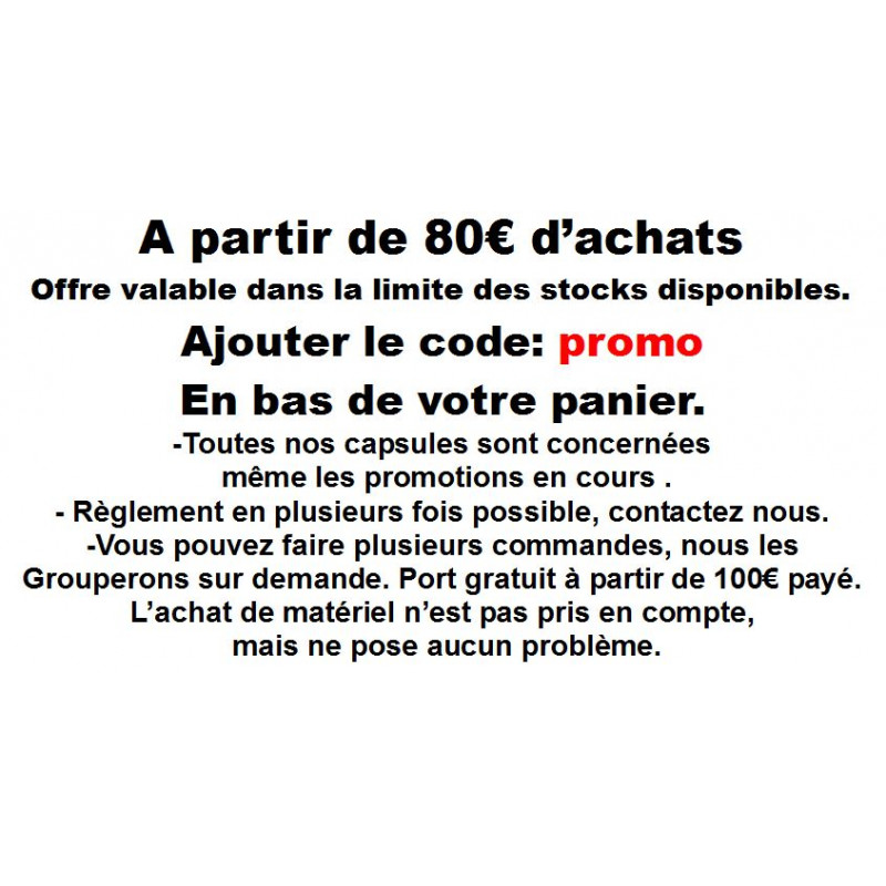 Date de fin 3 février -30% sur toutes nos capsules. A partir de 80 €uros d’achats . Ajouter le code: promo En bas de votre panier -Toutes nos capsules sont concernées même les promotions en cours. Afin d’en faire profiter un plus grand nombre nous acceptons le règlement en plusieurs fois, contactez nous.