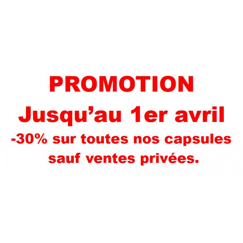 Date de fin 1er avril -30% sur toutes nos capsules. A partir de 80 €uros d’achats . Ajouter le code: promo En bas de votre panier -Toutes nos capsules sont concernées même les promotions en cours. Afin d’en faire profiter un plus grand nombre nous acceptons le règlement en plusieurs fois, contactez nous.